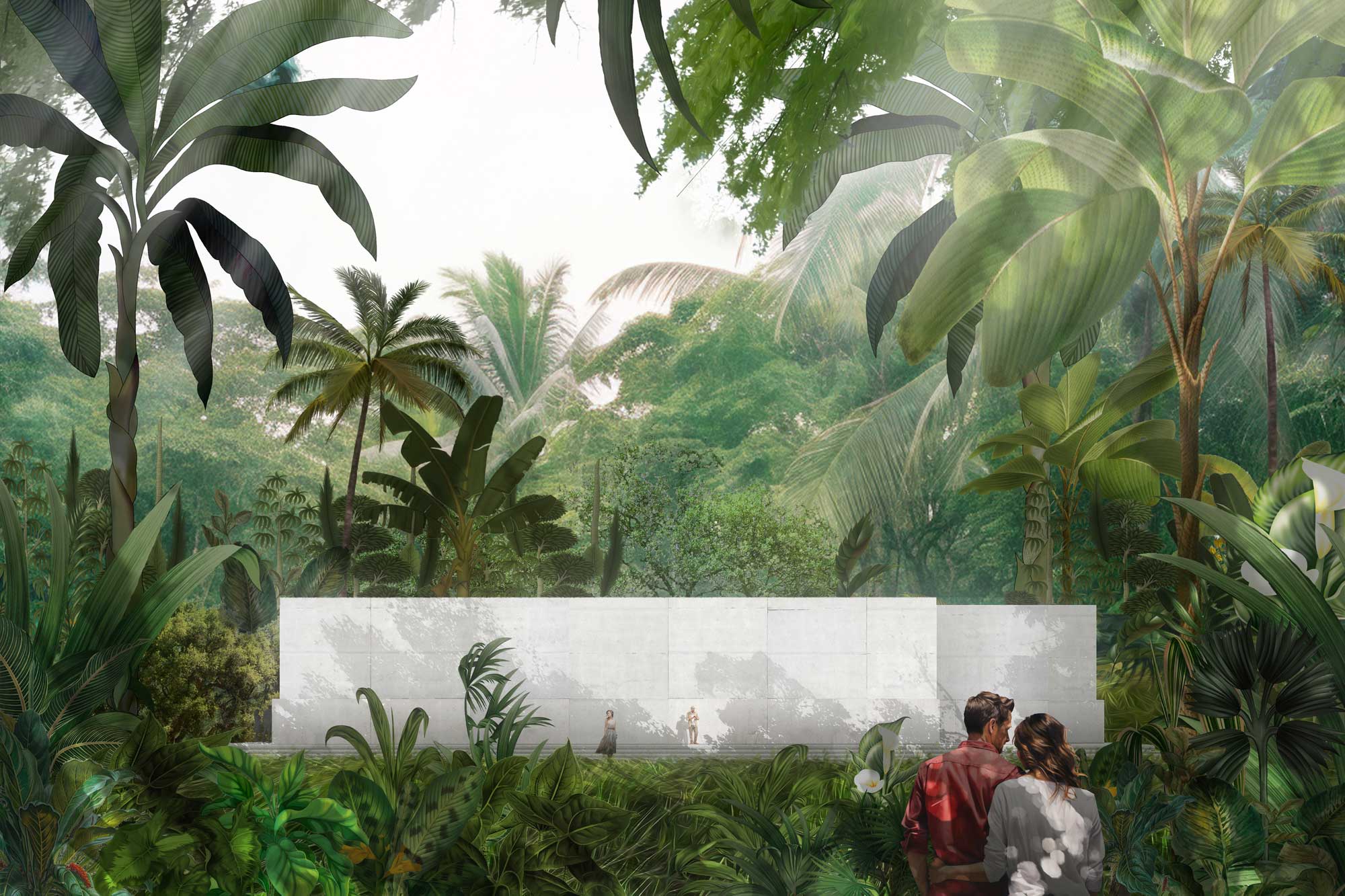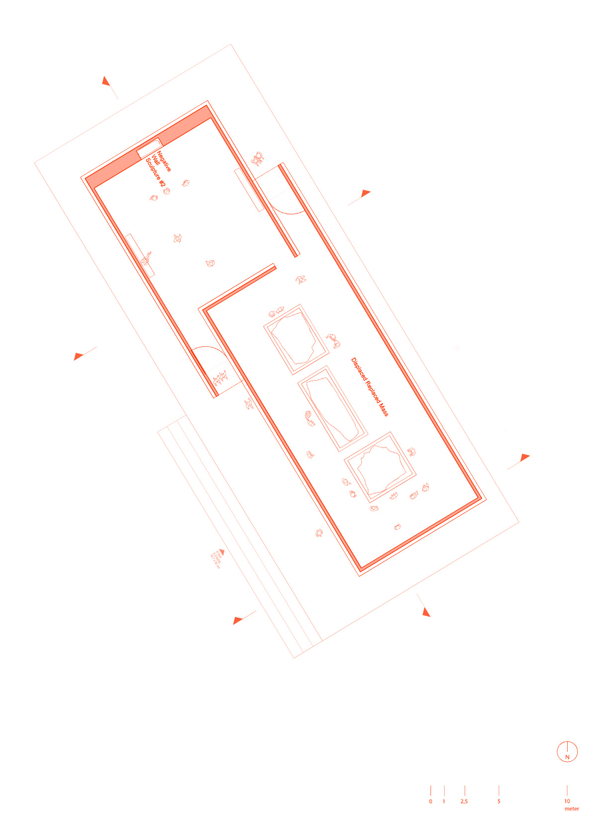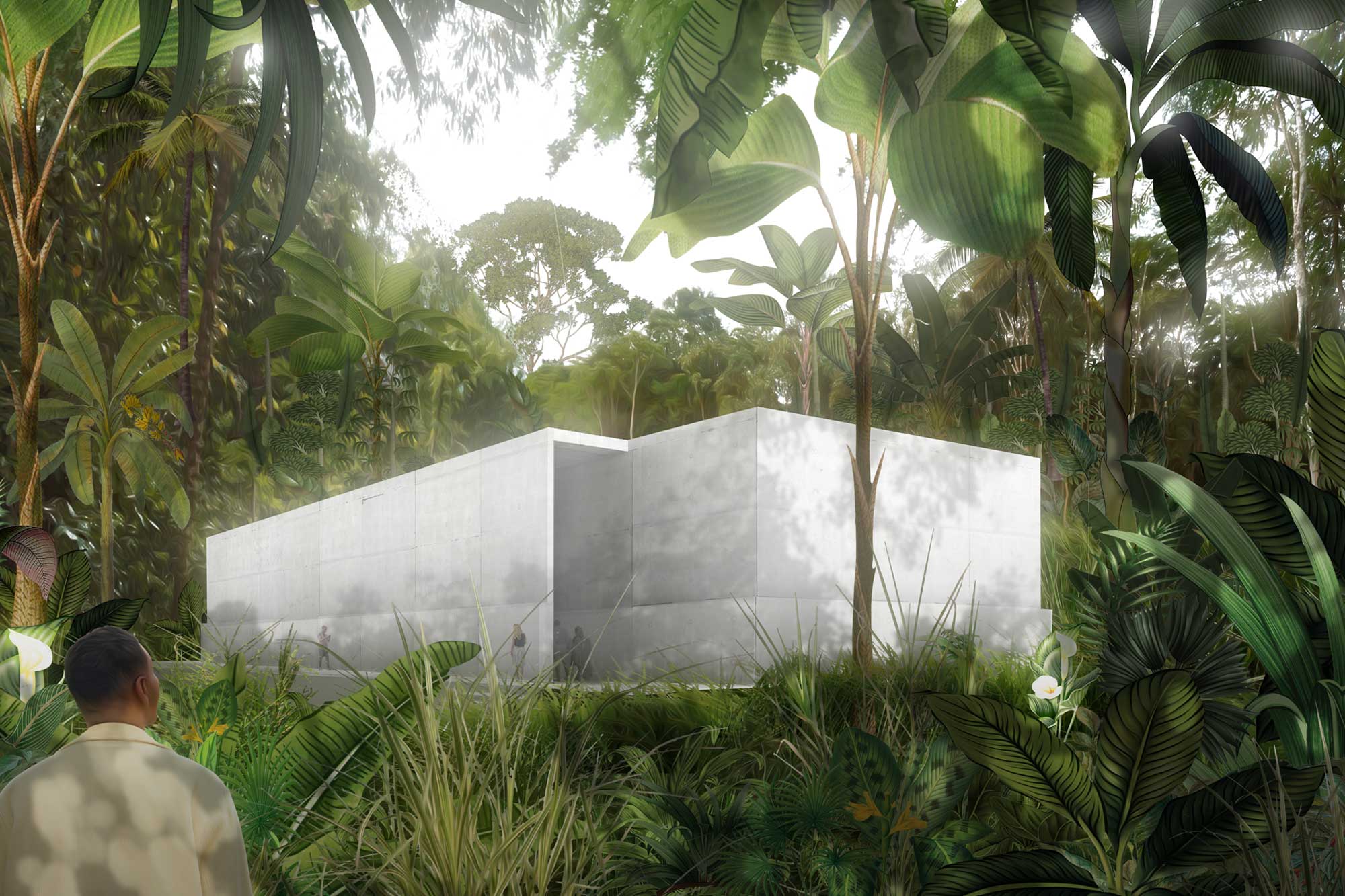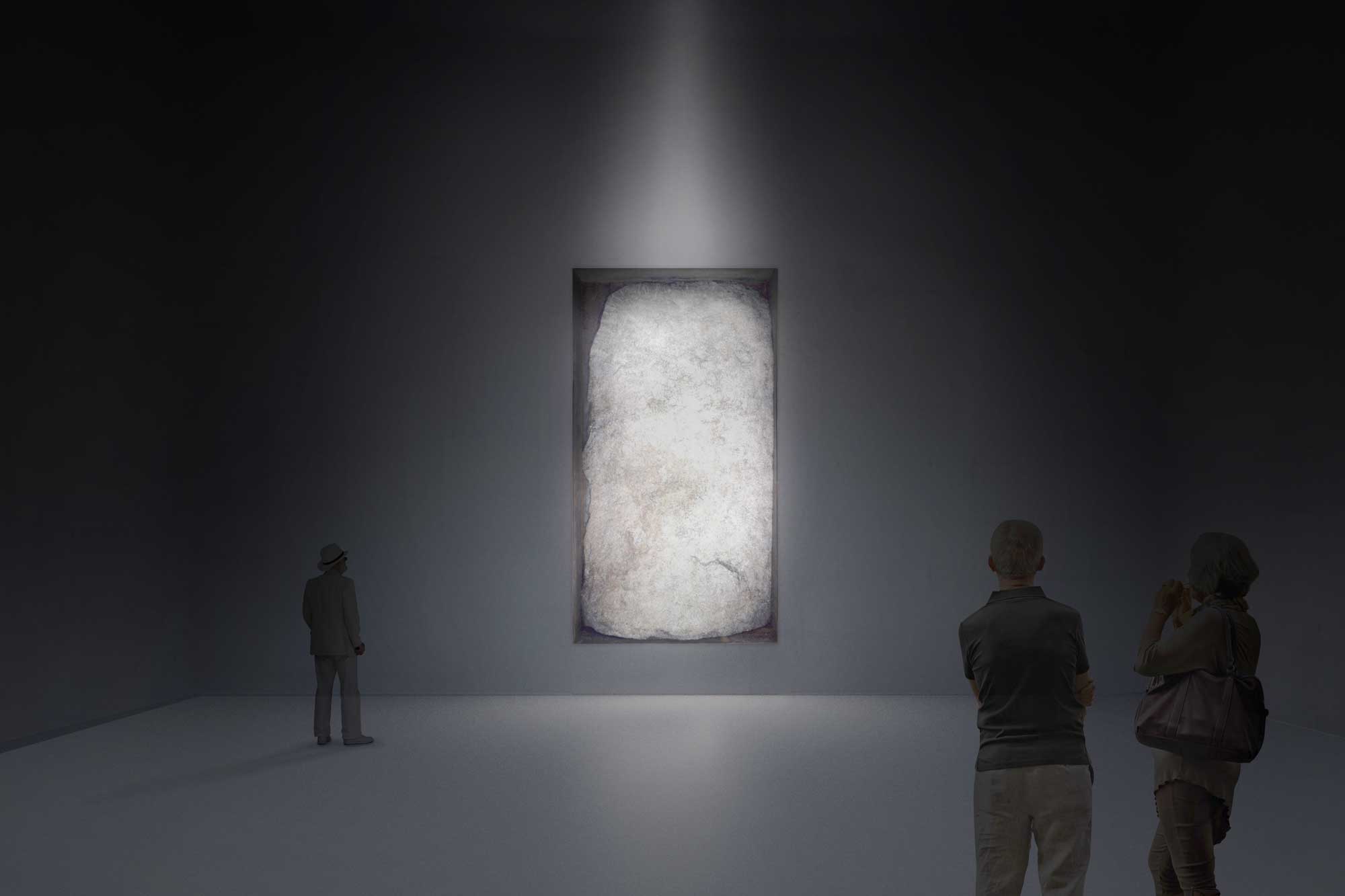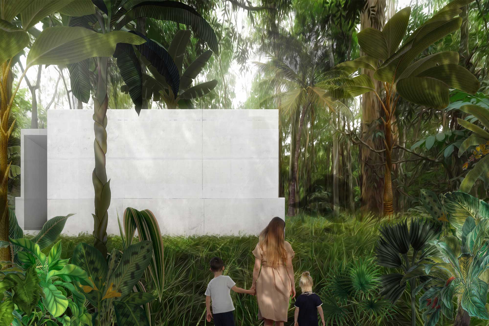 The building is conceived as a simple and powerful spatial sequence. Two angled concrete walls form tall corridors that guide visitors toward the artworks, creating a gradual sense of compression, anticipation, and discovery. The sculptures are revealed only at the end of this movement, placed deep within the structure to heighten focus and intensity.